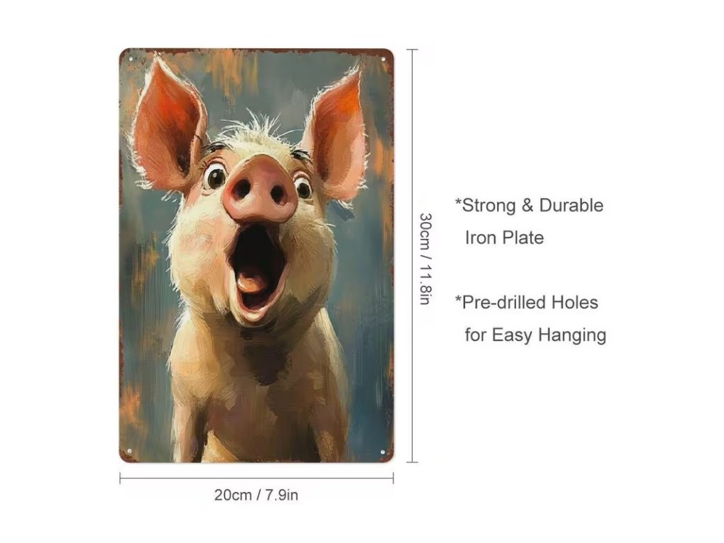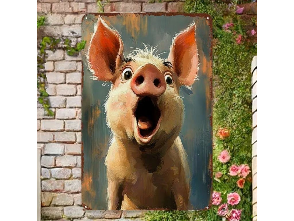 Krásná cedule s překvapeným čuníkem. Vhodná je obzvláště jako dárek pro radost.