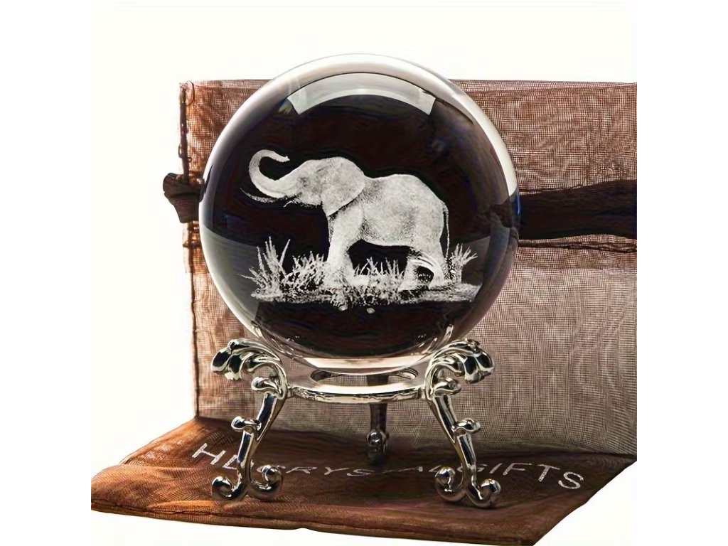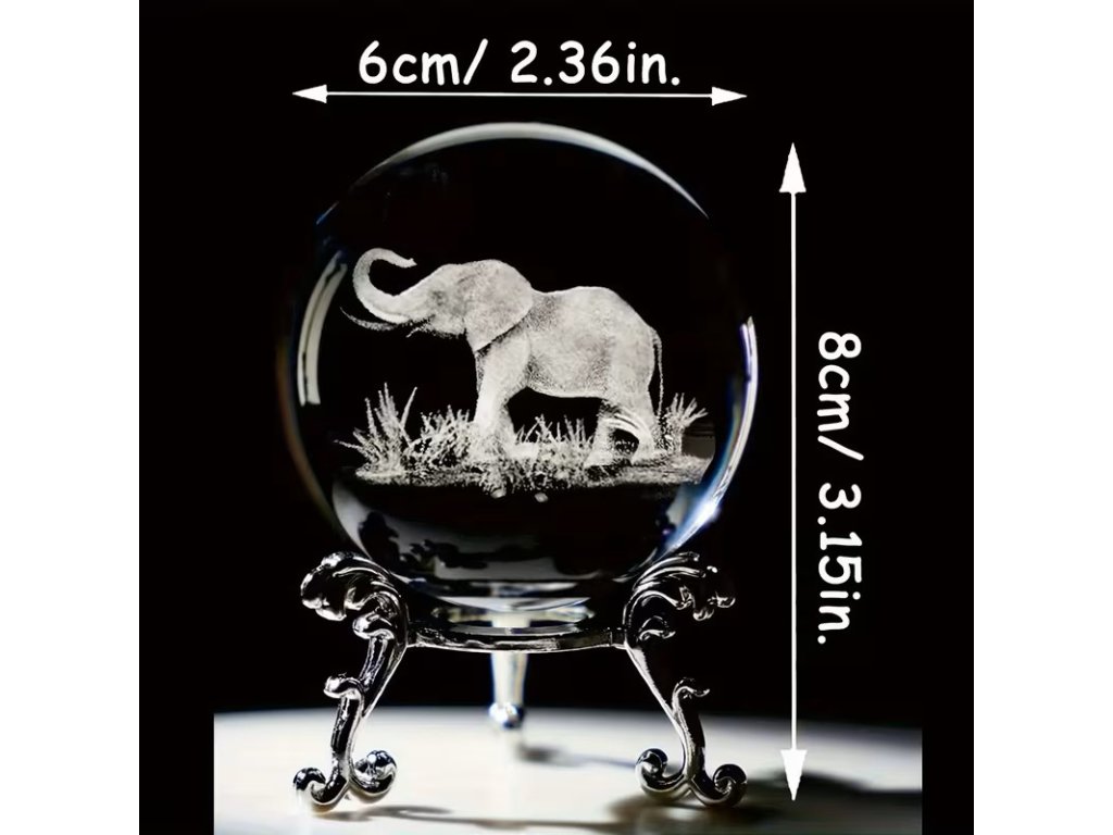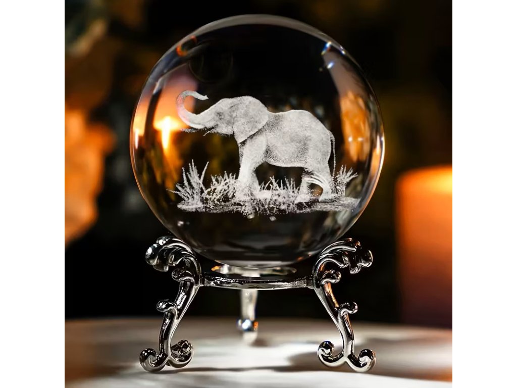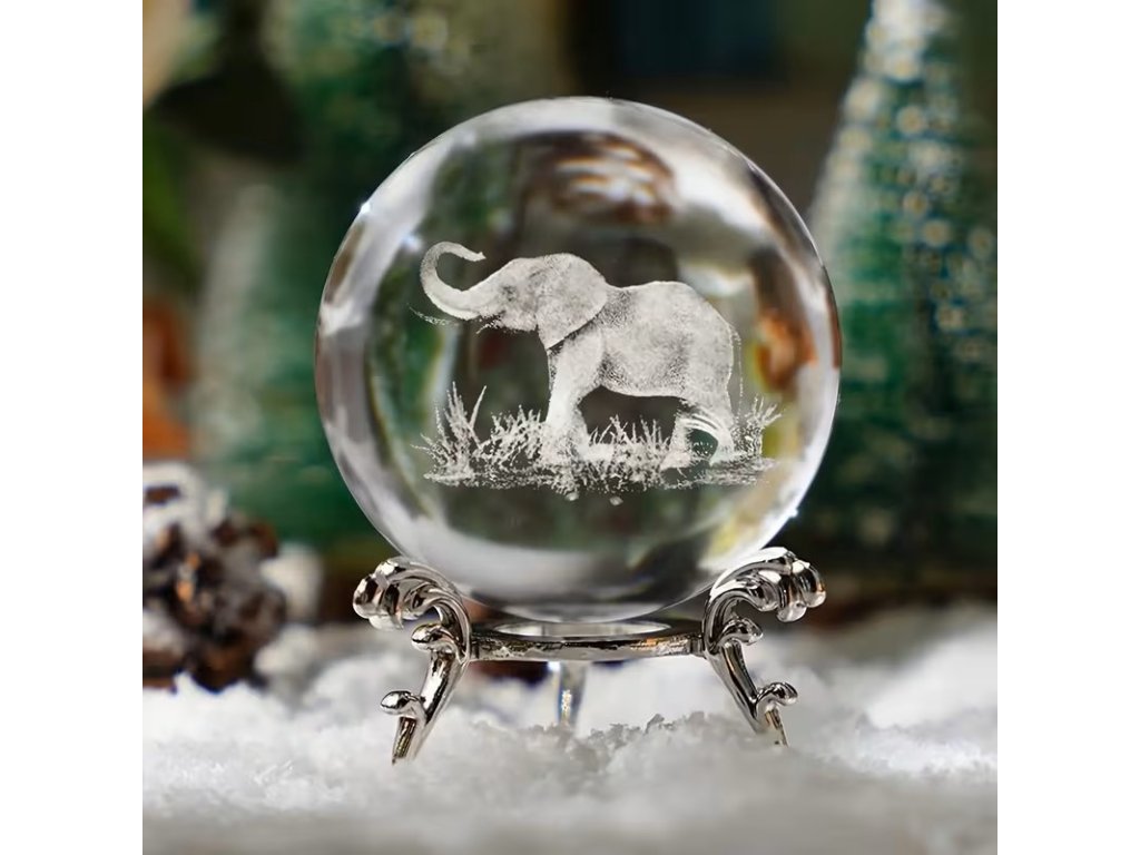 Laserem gravírovaná skleněná koule s vyobrazením slona na podstavci v barvě stříbrné