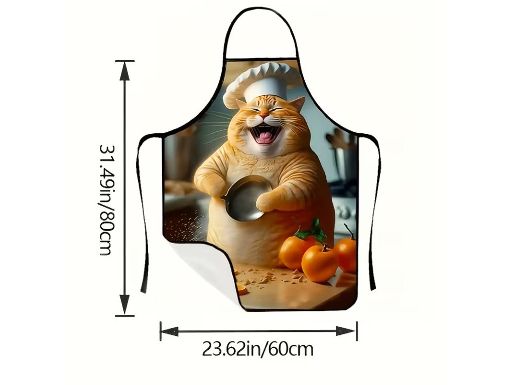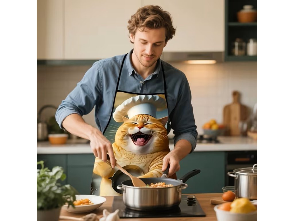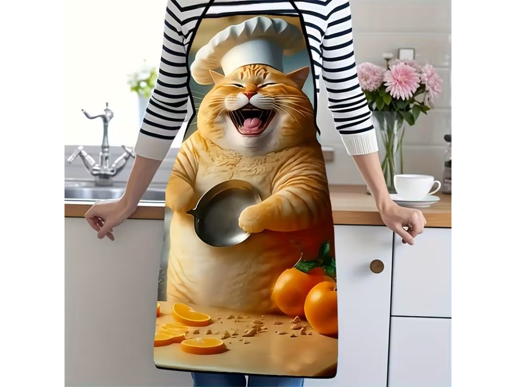 Krásná zástěra s kocourem v kuchyni. Velikost na fotografii