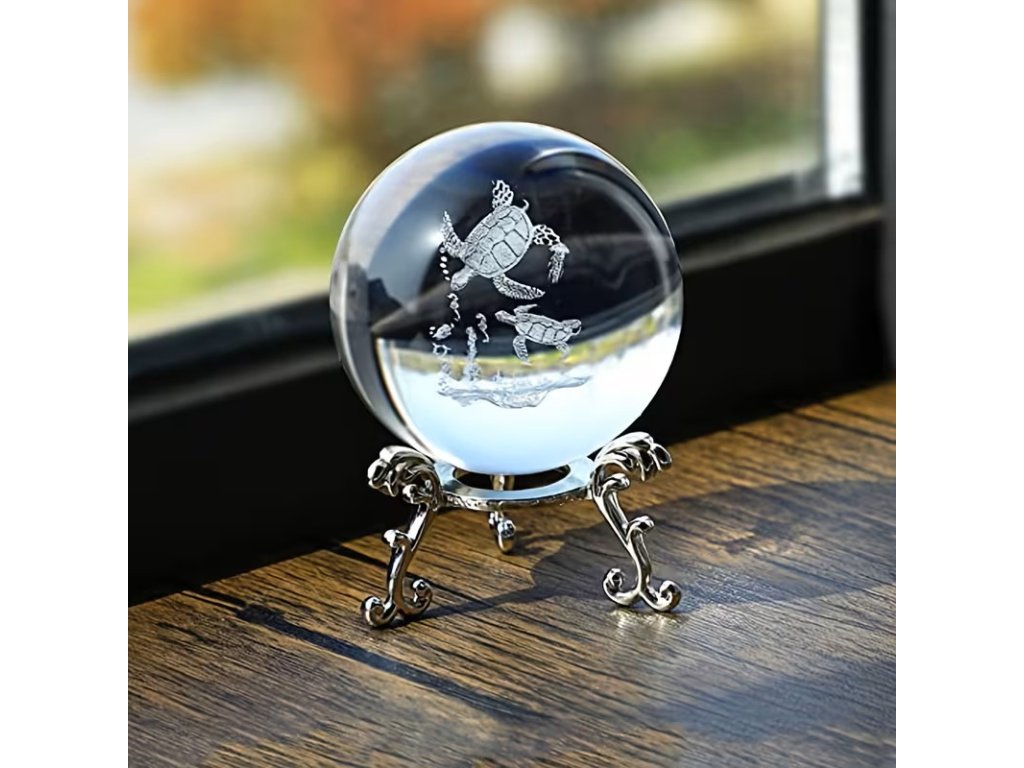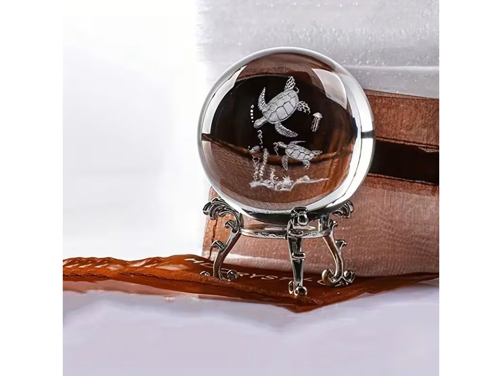 Laserově gravírovaná skleněná koule Želva 6 cm. Podstavec v barvě stříbrné
