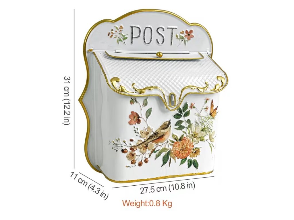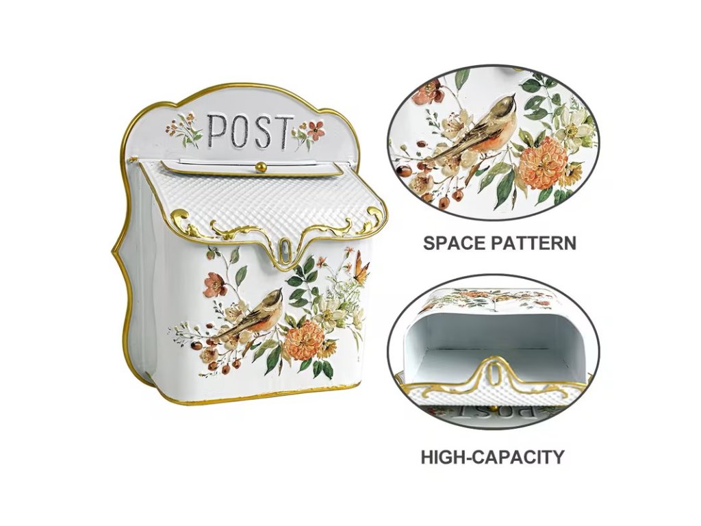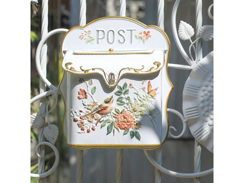 Poštovní schránka bílá s ptáčky. Nádherně propracovaná kovová poštovní schránka. Romantický vzor s ptáčky a květinami. Bílá barva