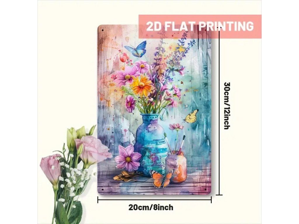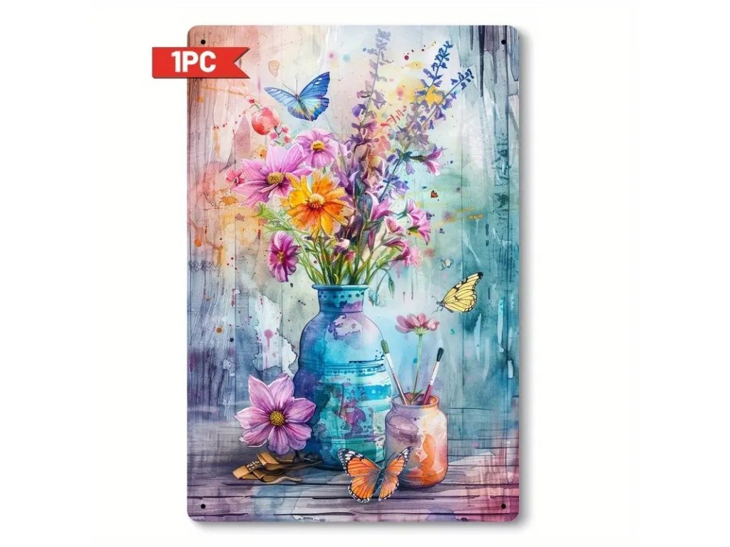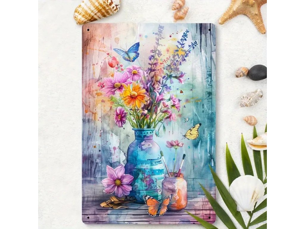 Nástěnná kovová cedule. Kvítí s motýlky 30 x 20 cm
