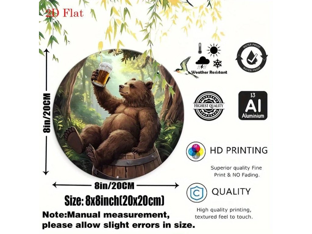 Nástěnná kovová cedule MEDVĚD S PÍVEM. Průměr 20 cm