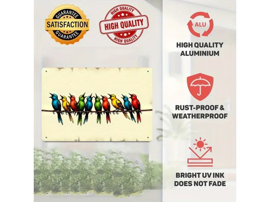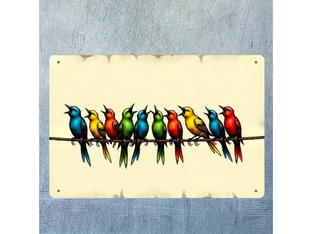 Nástěnná kovová cedule Špačci na drátě. 20 x 30 cm