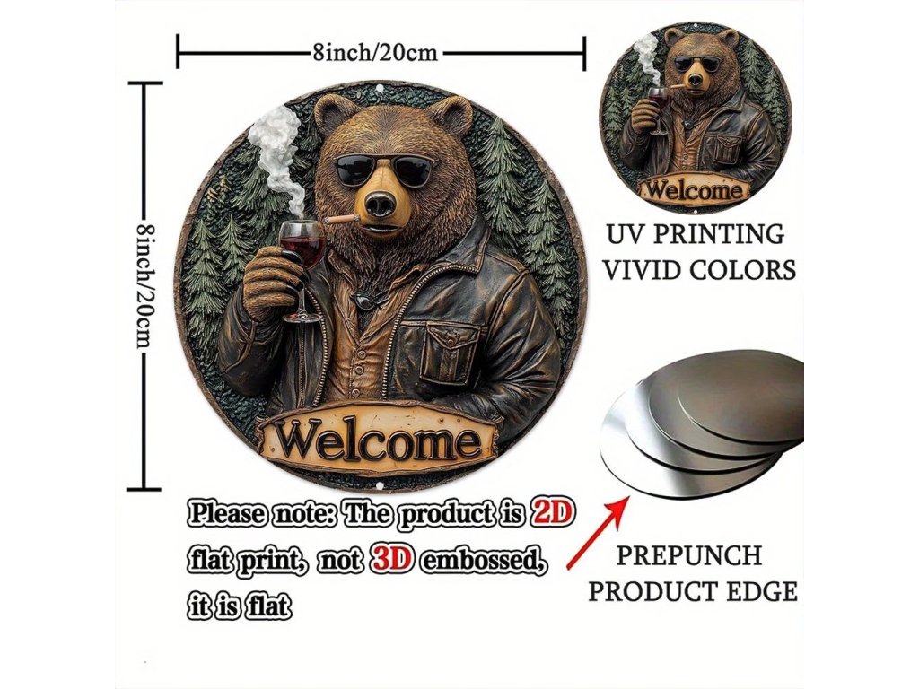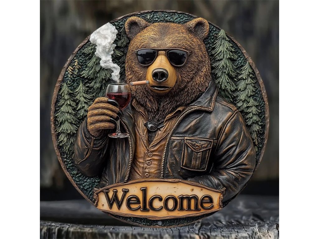 RETRO plechová cedule 2D - MEDVĚD S VÍNEM průměr 20 cm