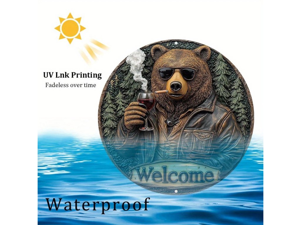 RETRO plechová cedule 2D - MEDVĚD S VÍNEM průměr 20 cm. Vhodná do interiéru i ven