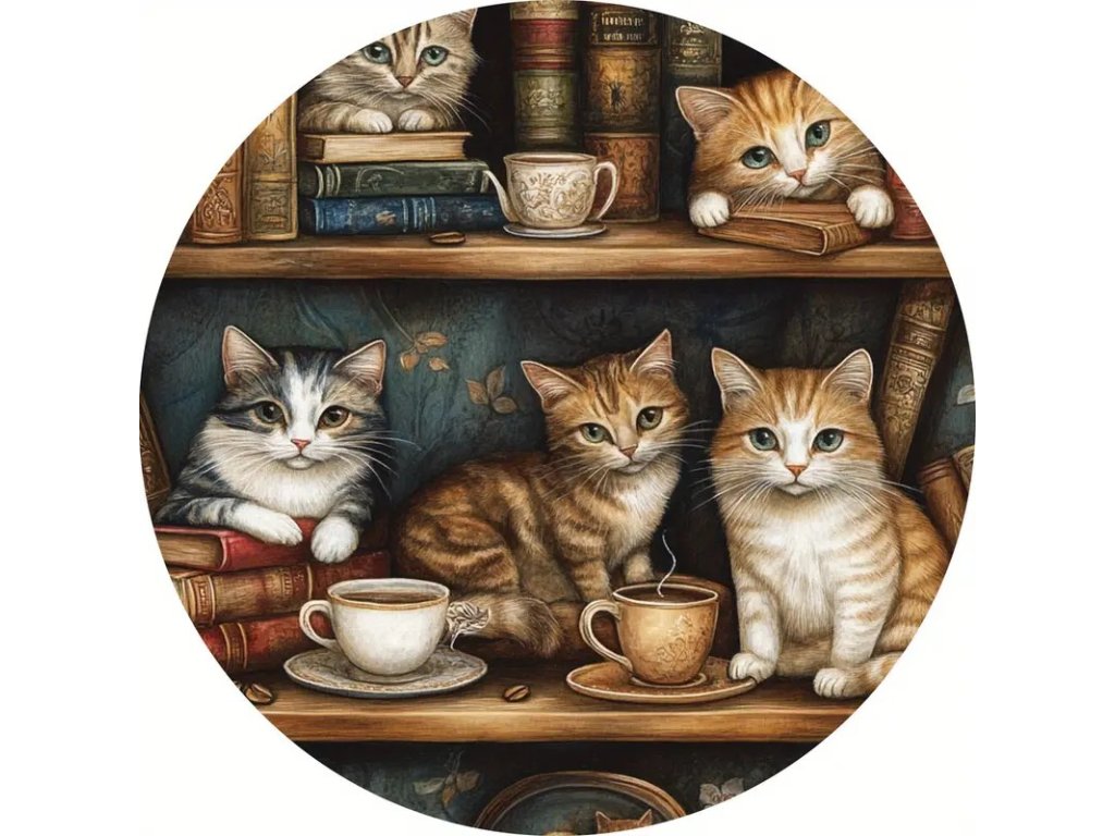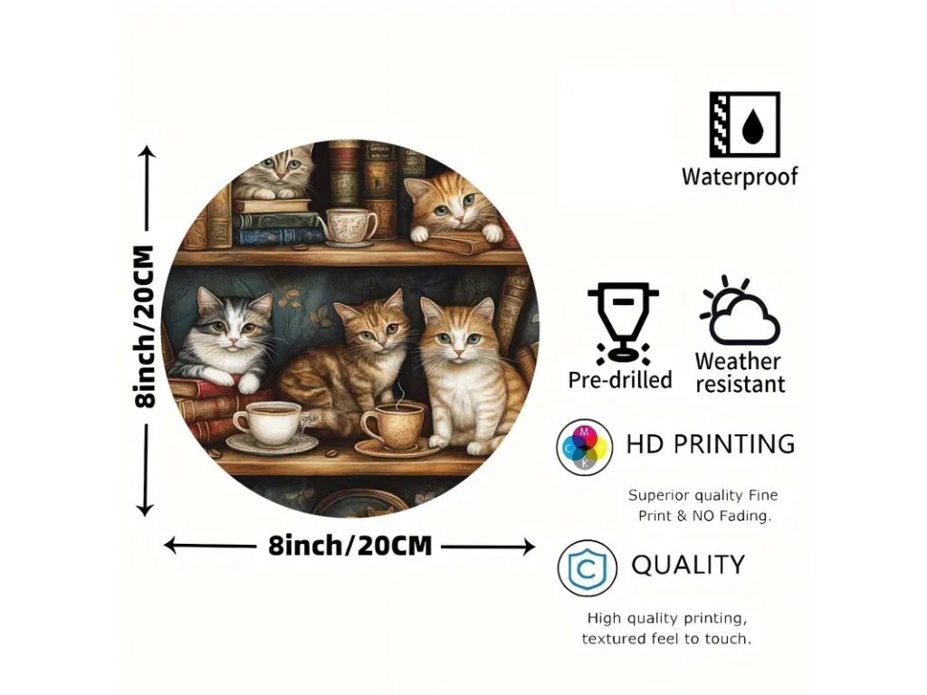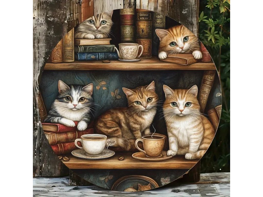 Kulatá kovová cedule. Kočky v knihovně - průměr 20 cm