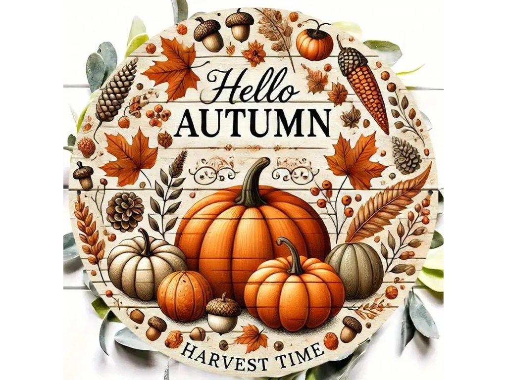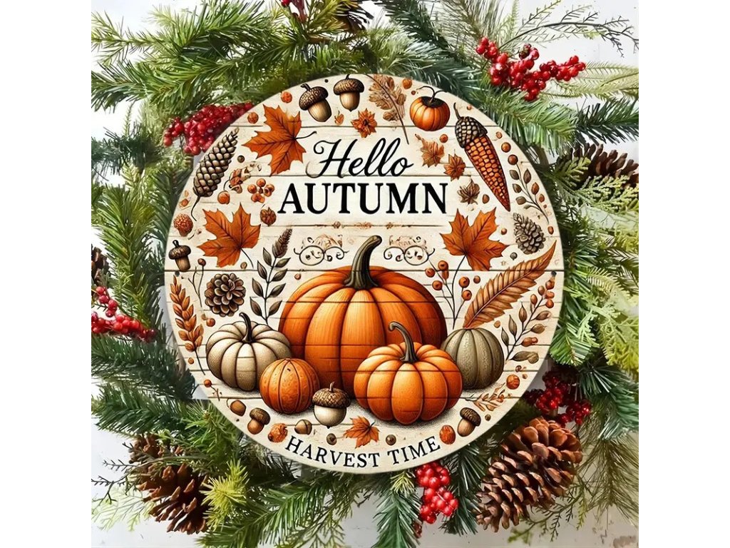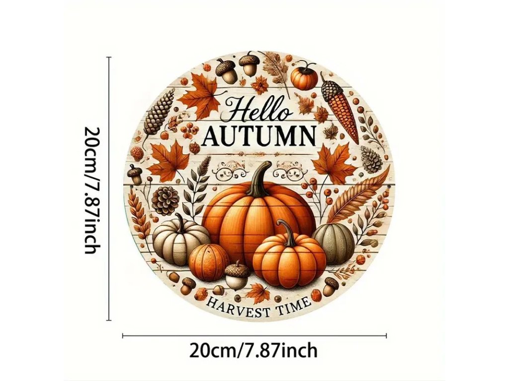 Nástěnná kovová cedule Dýně na podzim. Průměr 20 cm