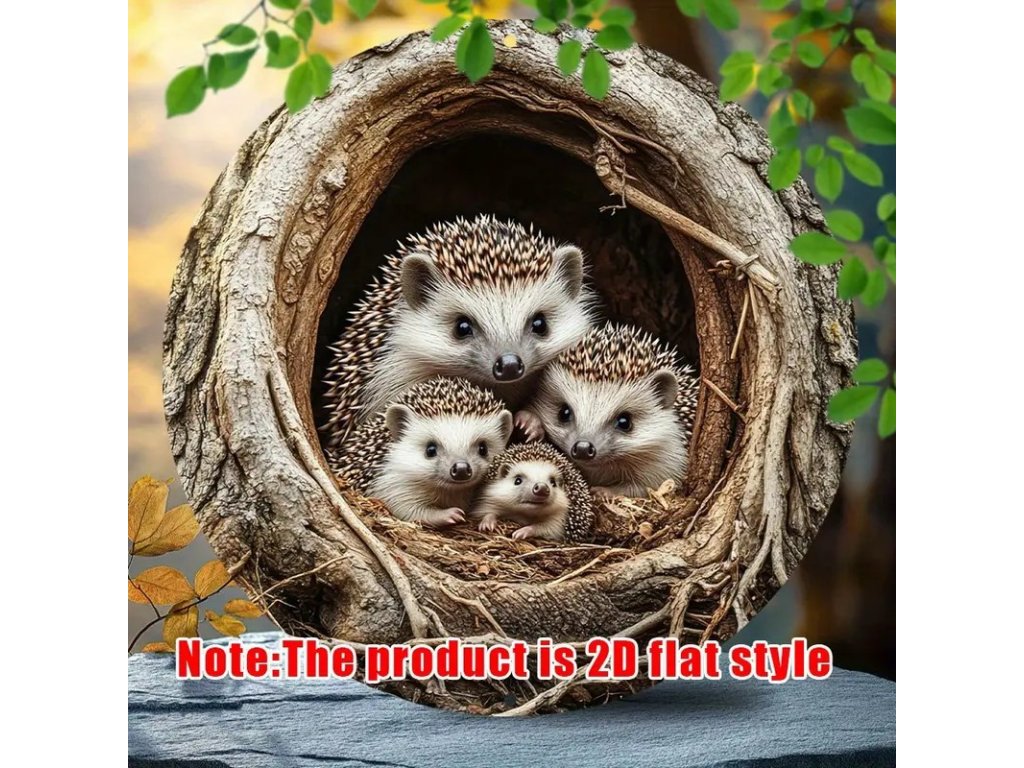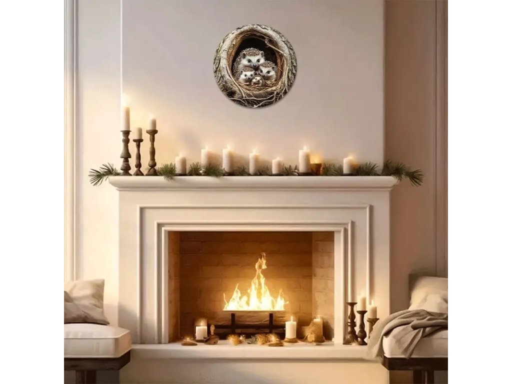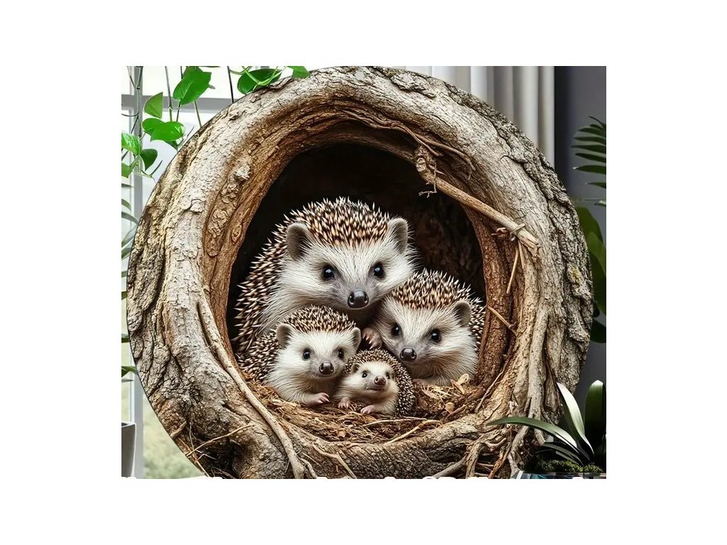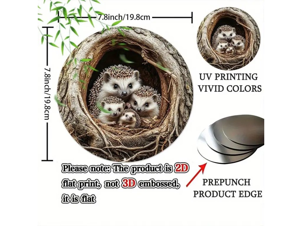Nástěnná kovová cedule Rodinka ježků. Průměr 20 cm